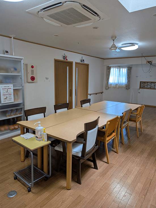 近くにはこども園があり時折り、子供達のかわいらしい声が聞こえてきます。真裏には神池公園があり、春には満開の桜を見ることが出来ます。施設内には、木目調の床、木の家具、ソファー等を配置しており、暖みのある、くつろげる雰囲気となっております。また、春にはお花見。夏には流しそうめんや七夕祭り、秋には味覚祭や遠足、冬には鍋をつついたり、年越しそば、おせち料理と様々な季節を感じられる取り組み、入居者様のQOL向上に向けた取り組みを行っております。