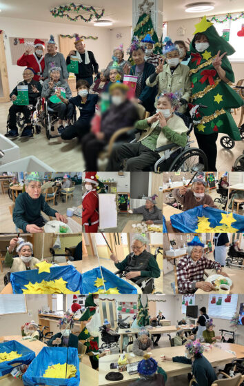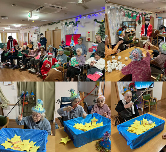 ツリーに飾り付けを行い、昼食はスタッフ手作りシチュー(にんじんは☆彡の形をしています)スパゲッティ、サラダ、パンです。おやつは、プチケーキとゼリー、クッキーをお召し上がりいただきました。サンタの恰好をしたスタッフが穴のあいた箱を背負って利用者様のもとへ。新聞紙で作ったボールに願いを込めて「えい!」と投げ入れていただきました。見事にボールをサンタさんが背負っている箱の中に入れることが出来たなのなら、きっとお願い事もサンタさんが叶えてくれると思います。その後は水の入っていないプールに星をたくさんちりばめて魚釣りではなく、お星さま釣りゲームを行いました。星にはお菓子がくっついており、ゲットできればそのお菓子がいただけちゃいます。「私はお菓子が星(ほし)い~」